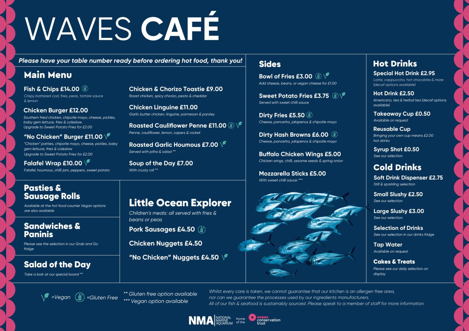 Our Waves Cafe is open from 10am – 4:15pm, with hot food being served from 11:30am – 2:30pm. Timings are subject to change during peak periods, please check our website for any updates or check with a team member onsite.